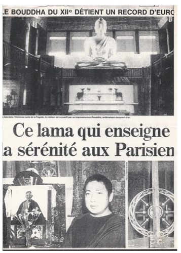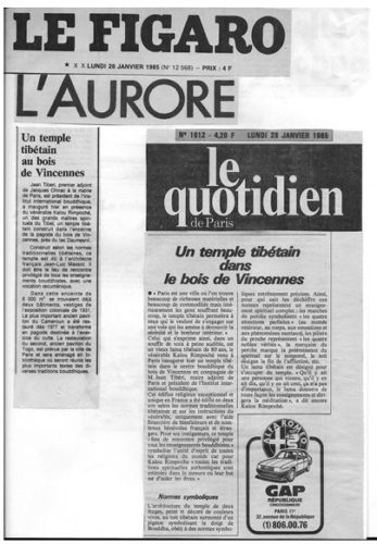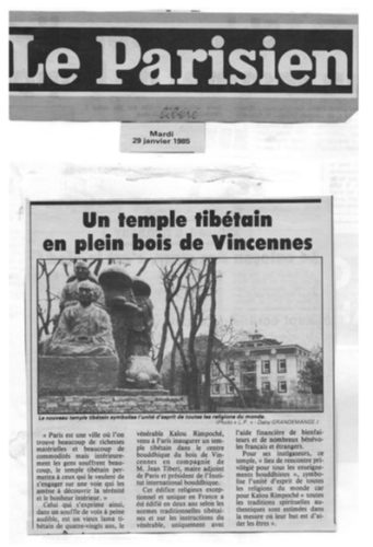 Lama Gyourmé, avec l’aide de son maître, se mobilise alors pour trouver des fonds afin de financer la construction d’un temple d’architecture traditionnelle tibétaine, l’actuel temple Kagyu Dzong, inauguré en 1985 dans l’enceinte du bois de Vincennes à proximité de la Grande Pagode grâce aux donations des disciples. | ![]() |