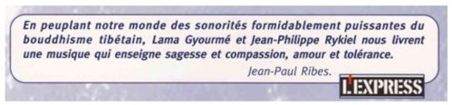 Depuis sa rencontre avec le pianiste Jean-Philippe Rykiel en 1994 et l’accompagnement des chants par une composition moderne au synthétiseur qui s’harmonise avec la ligne mélodique traditionnelle, Lama Gyourmé touche aussi un public non initié lors de nombreux concerts en France et à l’étranger (Italie, Espagne, États-Unis…). Le succès des concerts est tel qu’ils sont encouragés à enregistrer et diffuser les chants ainsi orchestrés. |